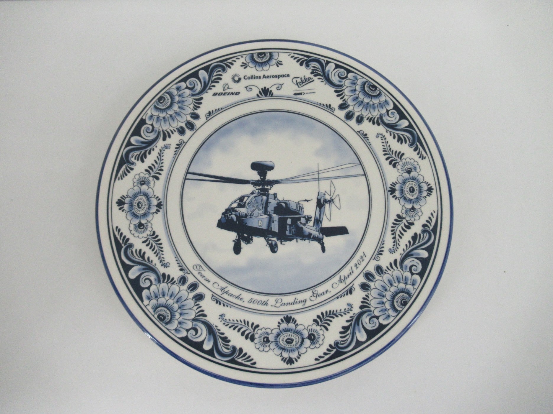 Handcrafted Delft wallplate featuring a striking depiction of the Apache AH-64 attack helicopter, rendered in traditional cobalt blue on white ceramic (decoration: printing technique) This commemorative piece celebrates military aviation heritage with authentic detailing characteristic of classic Dutch pottery craftsmanship. The timeless Delft design combines historical significance with decorative appeal. Suitable as a gift leaving a lasting impression todisplay in offices, studies, or collector spaces where precision engineering and cultural heritage converge. Price is to indicate what a personalised design in a small series would cost.